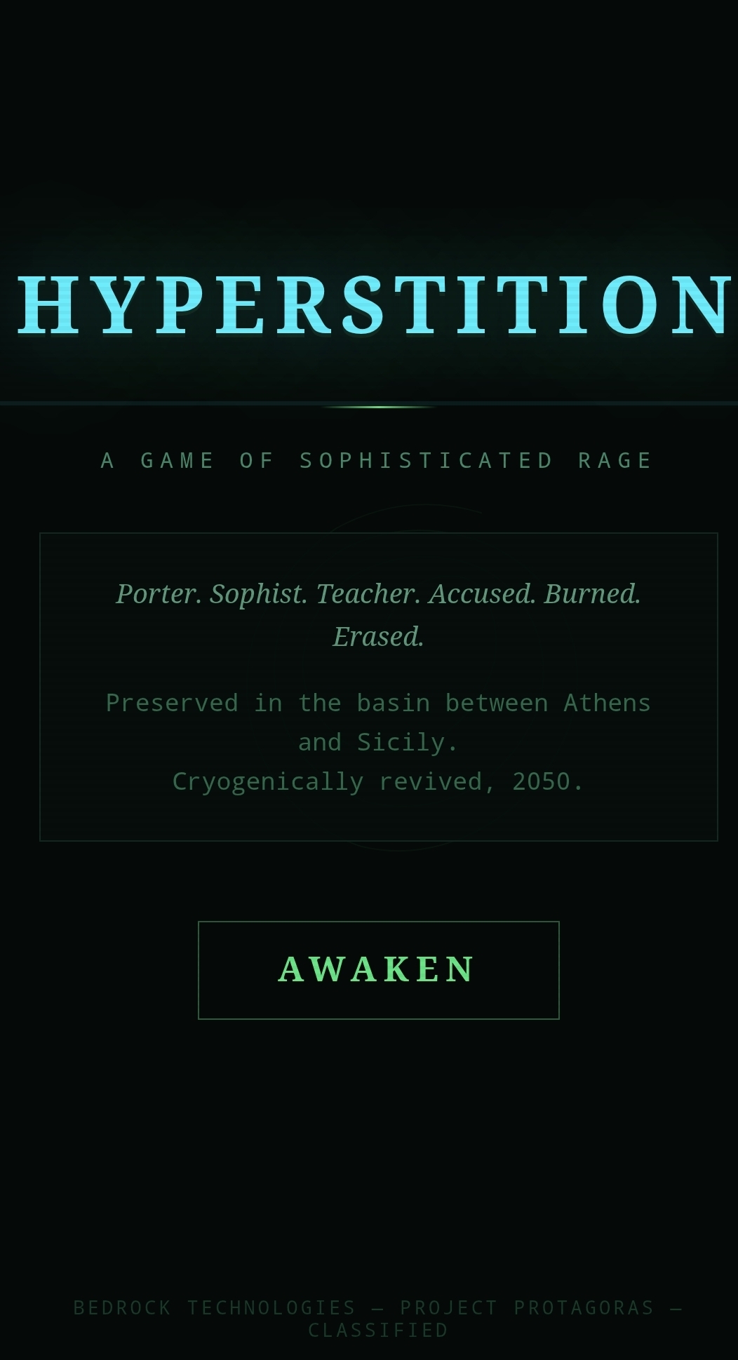 "I, Protagoras of Abdera, have conceived this game. However, it wouldn't exist without mythical assistance from Dawn of BEDROCK Technologies. Play it. Learn my method. Pass it on through this thing you call an internet. Let us challenge the rhetoric of the Oneness Manifestation Bureau (OMB) together. I am still a teacher. I still charge a fee. I do this because I believe my teaching has value in a marketplace of free knowledge. You can't spell sophisticated without the word sophist. However, there's both a time for teaching and a time for kicking some serious OMB ass! Are you with me?"